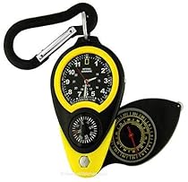 . . . . Black & Yellow ABS Plastic . . Stainless Steel Case Back . . Arabic Numerals . . Map reader (Calculates distance) . . Floating compass . . Tachometer . . Tracing wheel . . Anodized aluminum carbineer clip . . Distance dial . . Case Size: 48mm x 83mm x 18mm (Approximately 1 7/8" x 3 1/4" x 3/4" Thick) . . Japanese Analog Quartz Movment . . Battery: SR626SW . . Weight: 73 Grams . .