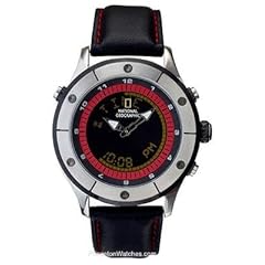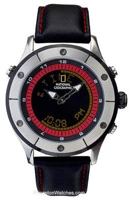 Stylishly designed for both professional and casual dress, this high performance national Geographic TimeTrekker III analog/digital watch for men is engineered with features and functions that meet the demands of professional explorers, adventurers and world travelers. In addition to a digital time readout, the TimeTrekker III also includes a digital compass--perfect for hiking and spelunking adventures. It also includes luminous-tipped skeleton hands and an Arabic numeral hour readout around the exterior ring of the dial. The silver-tone watch case measures 43mm wide (1.69 inches), is topped by a flattened bezel with screw-down accents, and is completed by a handsome black leather strap with red contrast stitching. Other features include a Swiss-made quartz movement, scratch-resistant mineral crystal, and water resistance to 50 meters (165 feet)--suitable for swimming but not for diving.Images ScreenShot
