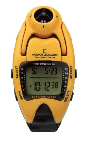 national Geographic Society Adventure watch by Egana designed for extreme outdoors. Unique pop-up wind speed meter that provides the wind chill temperature, a barometer, a thermometer, an altimeter, and a chronograph. Japanese digital movement with Swiss-made sensor, LCD face and dial, date and month display. Black polyurethane rubber strap with foldover push-button deployment. Water-resistant to 30M. Two year limited manufacturer warranty.Images ScreenShot