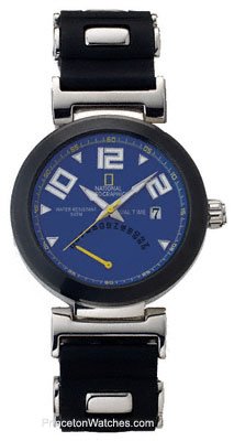 Designed for globetrotters with the need to keep track of two time zones, this national Geographic World Traveler Sierra I stainless steel men's watch offers a uniquely realized dual time design. It arches across the bottom of the dial and stands out from the royal blue wave-patterned background with a bright yellow coloring. The dial also includes luminous hands (with seconds hand), large luminous Arabic numerals at 10, 12, and 2 o'clock, small Arabic numerals and minute indexes around the exterior ring of the dial, and a date window at 3 o'clock. The round silver-tone watch case measures 46mm wide (1.81 inches), includes a flattened bezel, and is completed by a stainless steel bracelet accented with a black rubber covering on the top. Other features include a Japanese-made quartz movement, scratch-resistant mineral crystal, and water resistance to 50 meters (165 feet)--suitable for swimming but not for diving.I liked this watch when I saw it and liked it even more when I received it, but the first time I went to a water park water must have gotten in the case because after three weeks I still have water vapor on the glass and it has destroyed (bubbled) the numbers on the face. The watch says it's water resistant up to 5 ATM. I'm going to see if I can get a replacement from the manufacturer, although I'm not hopeful.